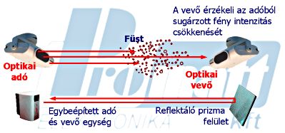 A vonali füstérzékelő fényelnyeléses elven működő optikai füstérzékelő. Az érzékelő az égéstermék jelenlétekor bekövetkező fény intenzitás csökkenést észleli. Az érzékelési spektrum: 0,1-10 ?m (egyaránt jól érzékeli a látható és a láthatatlan részecskéket). A védett tér hosszúsága max. 100 m, a védett tér szélessége max. 14 m lehet. Az érzékelő integráló működésű: ha a füst hosszabban van a sugárban, a jelzéshez kisebb füstkoncentráció is elég, hiszen a sugár hosszában összeadódik a fény által áthatolhatatlan füstréteg vastagsága.