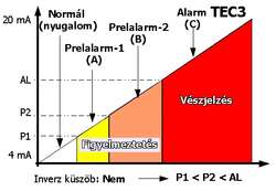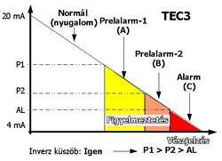 Különleges esetekben szükség lehet a két jelzési szintű TEC2 típusazonosító használatára (ld. 12. ábra). Ebben az esetben egy középső, ?normál? tartományt lehet megadni a mérési tartományon belül, melyet bármilyen irányban átlépve a modul vészjelzést ad.
