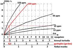 Szénmonoxid esetén ÁK=33 mg/m3 (28 ppm), míg CK=132 mg/m3 (113 ppm) értékeket ad meg a rendelet. Ha most visszatekintünk a 2. ábrára, akkor jól látható, hogy majdnem teljes az egyezés a nyugalmi, illetve könnyű terheléses tevékenységek adataival. Az ÁK értéket tehát azokon a helyeken kell határkoncentrációnak tekinteni, ahol a dolgozók egy teljes műszakban ki vannak téve a káros hatásnak, míg a CK érték a rövidebb periódusokig fennálló határértéket adja meg, amely például egy garázs esetén vehető alapul.