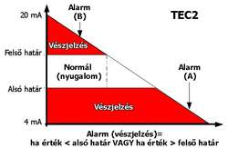 - 20 mA esetén a mérési tartomány felső határának megfelelő értéknek tekinti.
