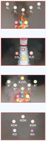 Amikor az aeroszol eléri a lángokat, főként kálium gyökök (K*) szabadulnak fel a káliumsók (pl. K2CO3) hő hatására történő felbomlásából. A kálium gyököknek (K*) az összes többi anyaghoz való kapcsolódási képessége nagy, ezért hozzákapcsolódnak más szabadgyökökhöz, amelyek egyébként a láncreakció motorjai lehetnének (hidrogén, oxigén, hidroxid - H*, O*, OH*). Ezáltal olyan stabil anyagok keletkeznek mint a KOH, mely nem reagál tovább. A reakció során tehát végtermékként stabil anyagok, KO, KH, KOH keletkeznek, így elegendő oltóanyag esetén a tűz kialszik. Az oltás során keletkezett anyagok nem ártalmasak az emberekre, a környezetre, és nem tesznek kárt az anyagi javakban sem.